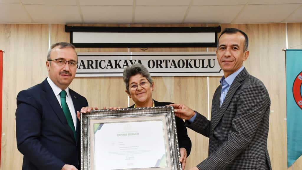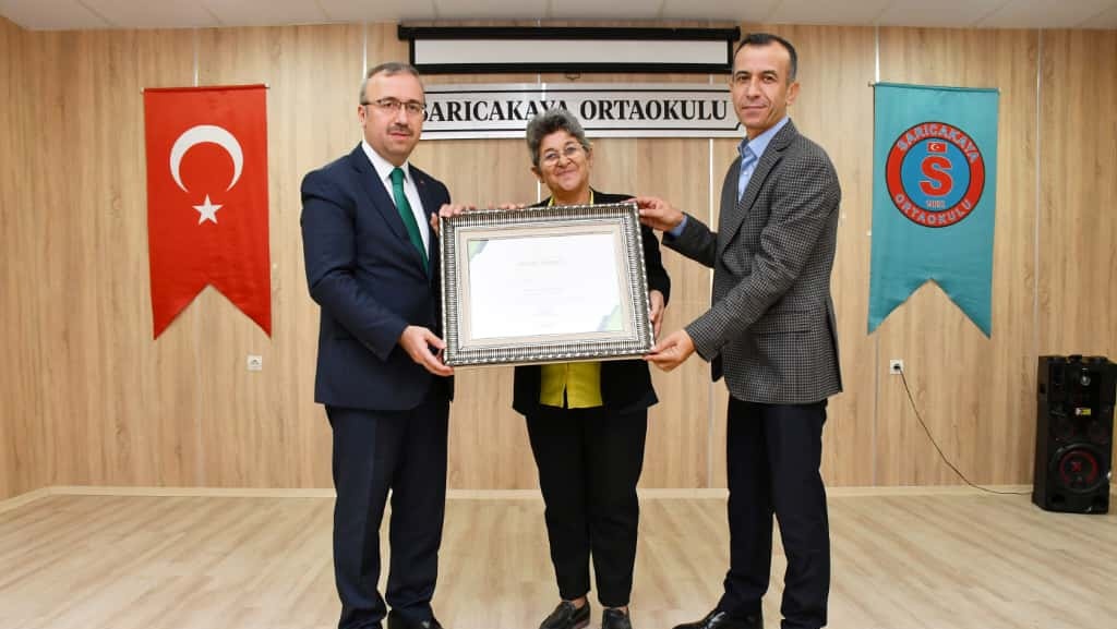 Sıfır Atık Yarışması "Yaşayan Okul Bahçeleri" alanında Eskişehir İl Birincisi olan okulumuza, Milli Eğitim Bakanımız Sayın Yusuf TEKİN imzalı Çevre Beratı ödülümüz, Eskişehir Milli Eğitim İl Müdürümüz Sayın Sinan AYDIN ve Sarıcakaya Belediye Başkanımız Sayın Ahmet DÖNMEZ tarafından, okulumuz adına Okul Müdürümüz Sayın Necla UYAR'a takdim edildi. Saygı duruşu ve İstiklal Marşımızın okunmasından sonra Okul Müdürü Necla UYAR konuşma yaptı. Yaşayan Okul Bahçeleri videosu izlendi. Milli Eğitim İl Müdürümüz Sayın Sinan AYDIN ve Sarıcakaya Belediye Başkanımız Sayın Ahmet DÖNMEZ konuşma yaptılar.